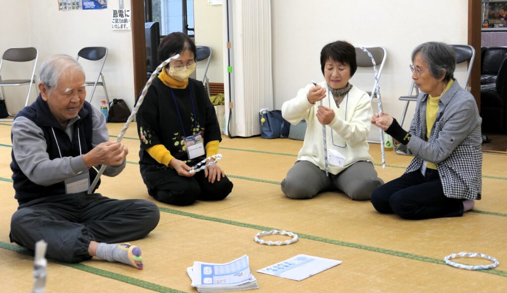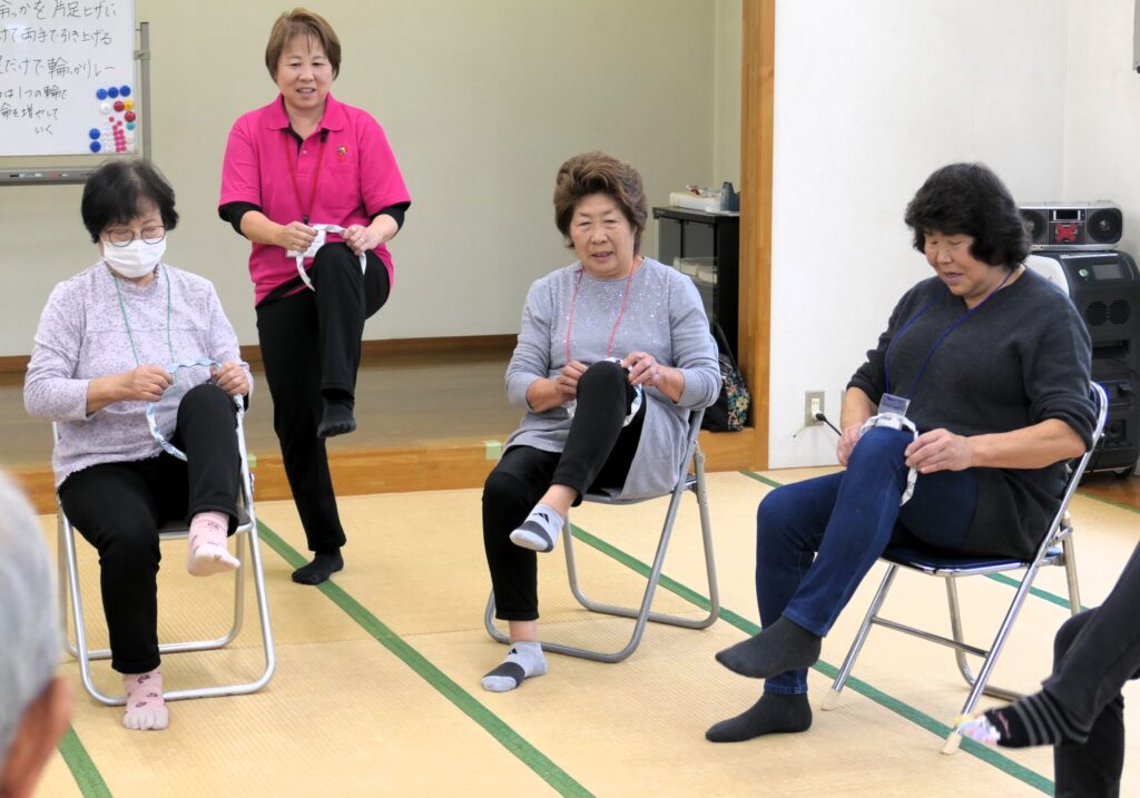 いすに座って ヒザに輪っかをかけて、両手で引き上げます。ん~足、ちゃあんとあがってますね~😀