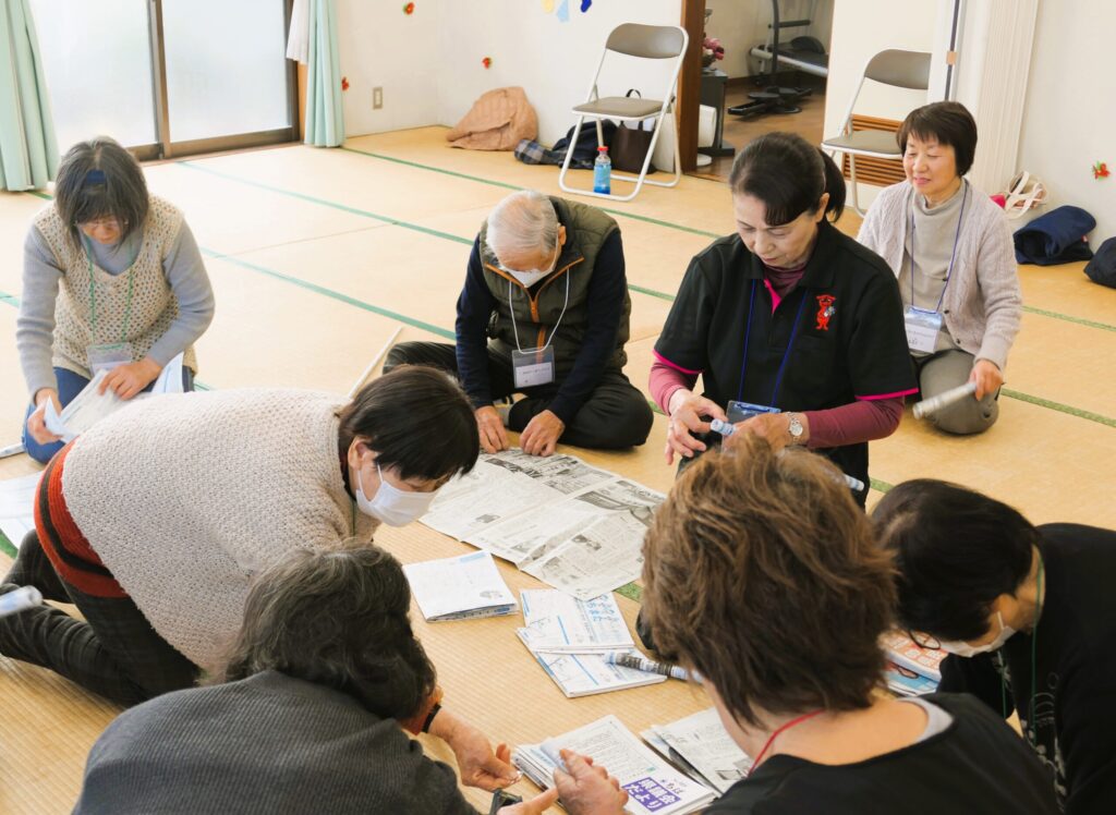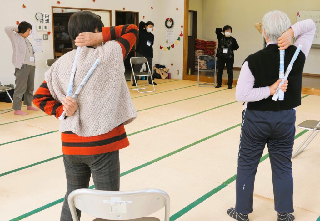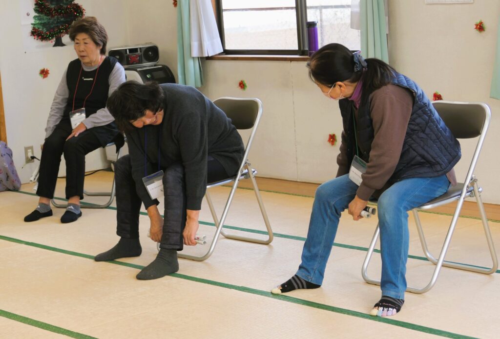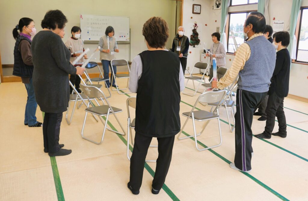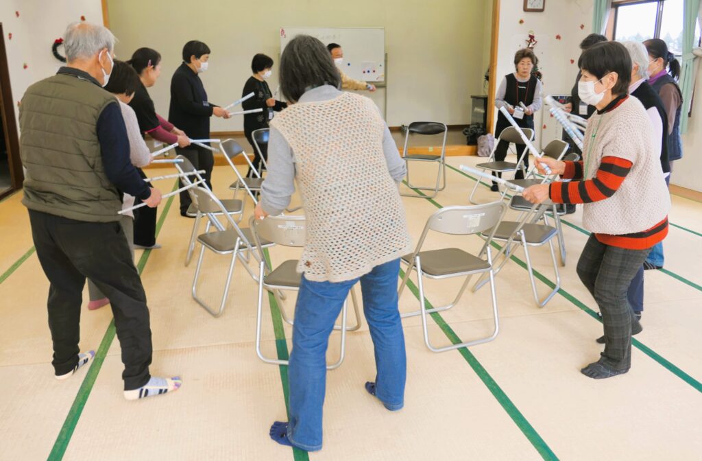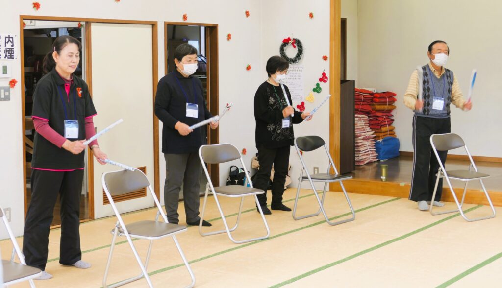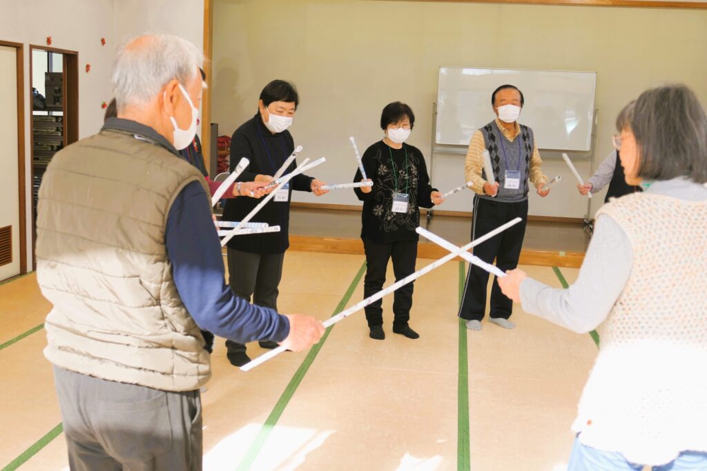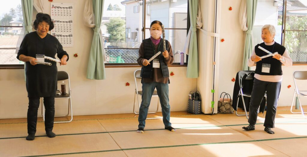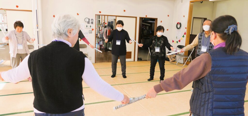 1,2,3のリズムで隣の人のバチを叩いたり上でクロスしたり、下へ降ろして輪をつなげたり…みなさん器用にリズムに乗れていました🤩