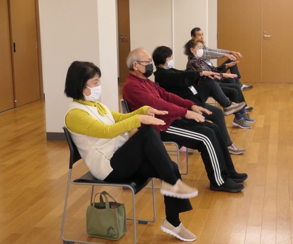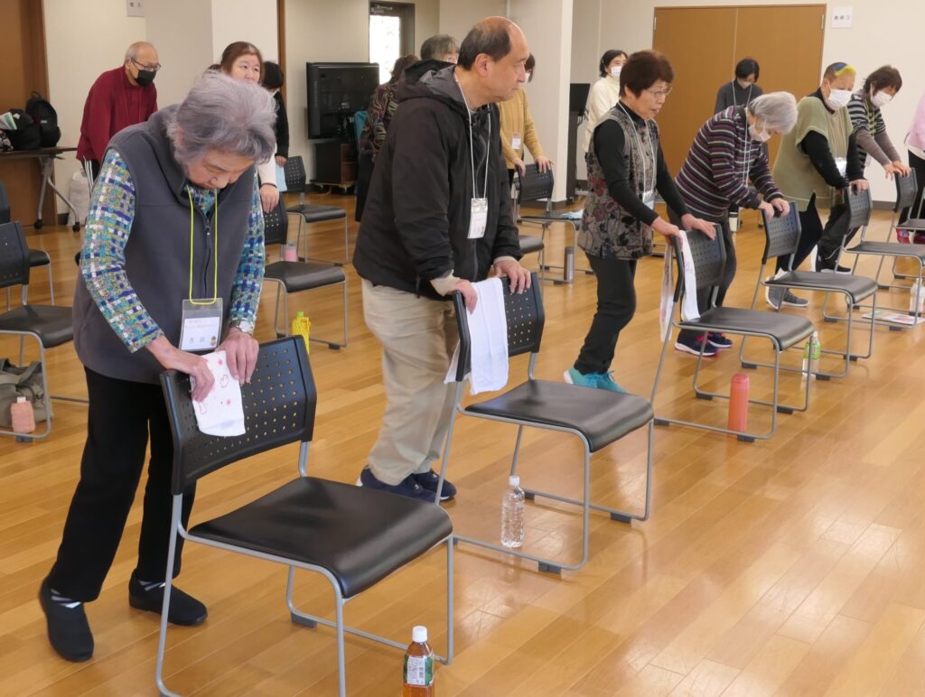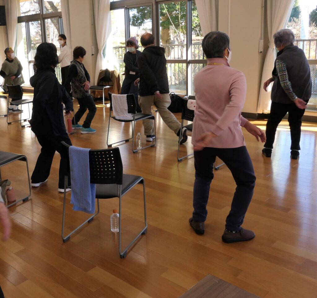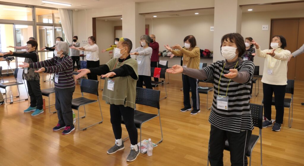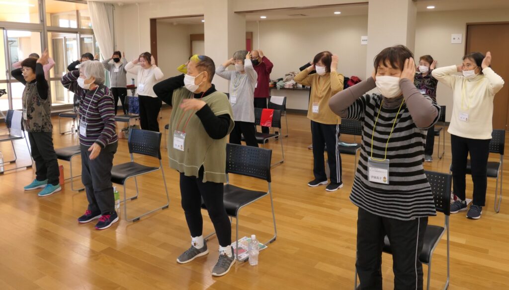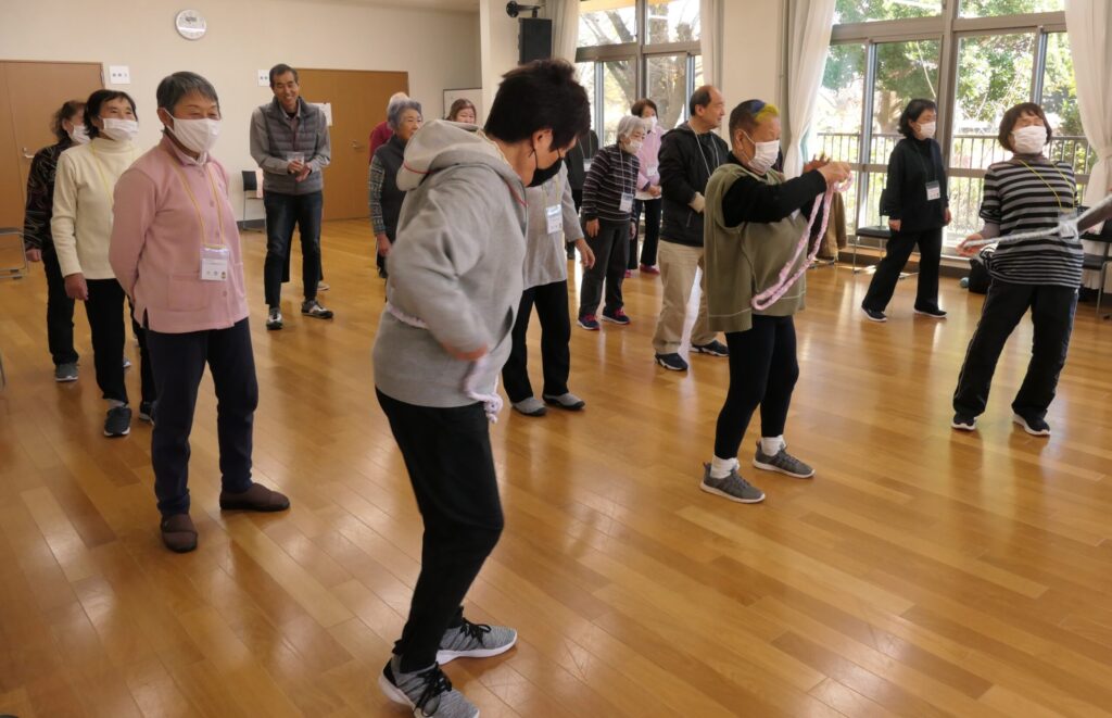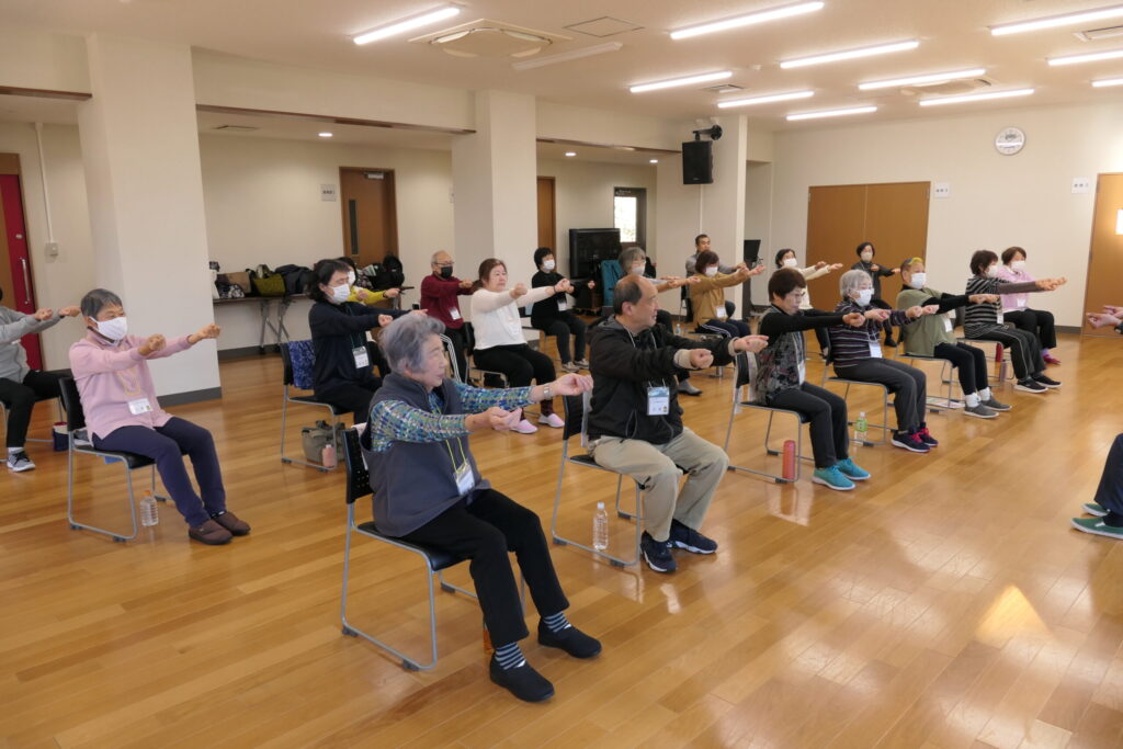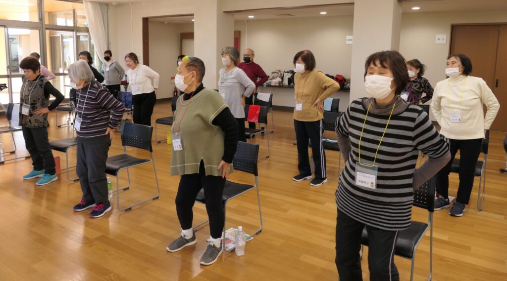20名の参加者と介護予防リーダーの井花さん、佐藤さんで5回目が始まりました。
