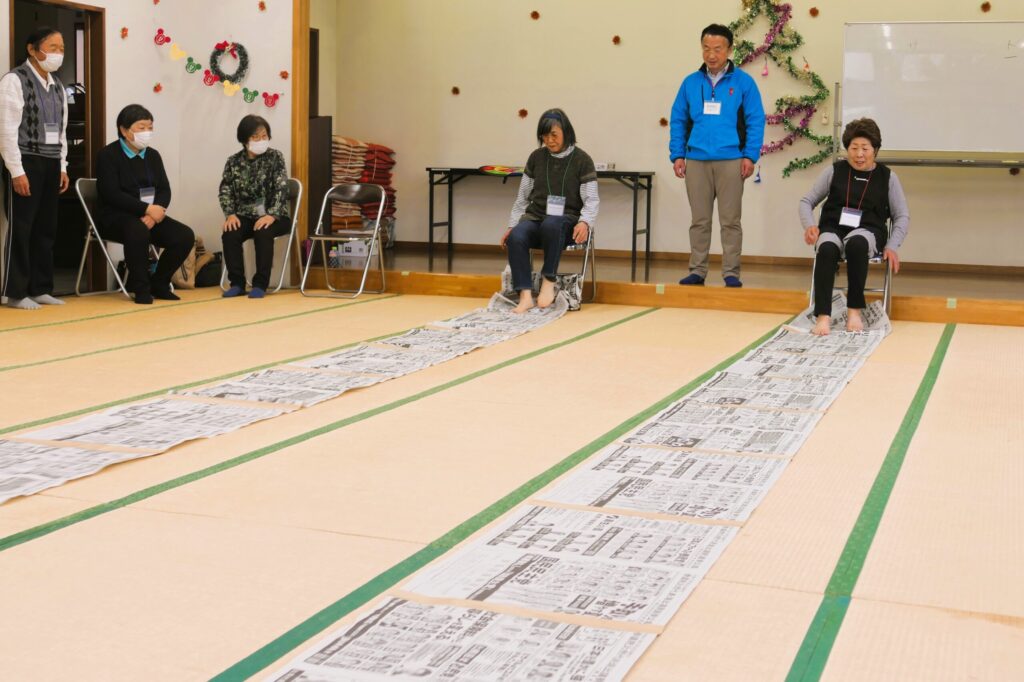 ただのリレーではなく、帯状につないだ新聞紙を椅子に座った状態で足だけでたぐり寄せていくゲーム👣