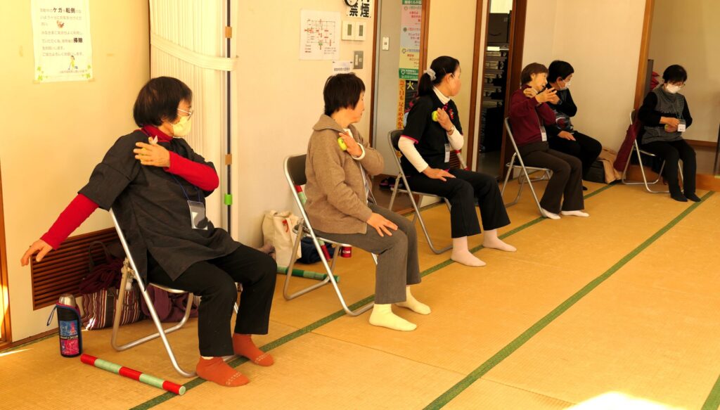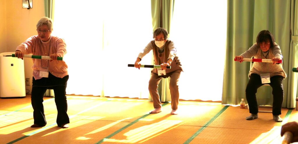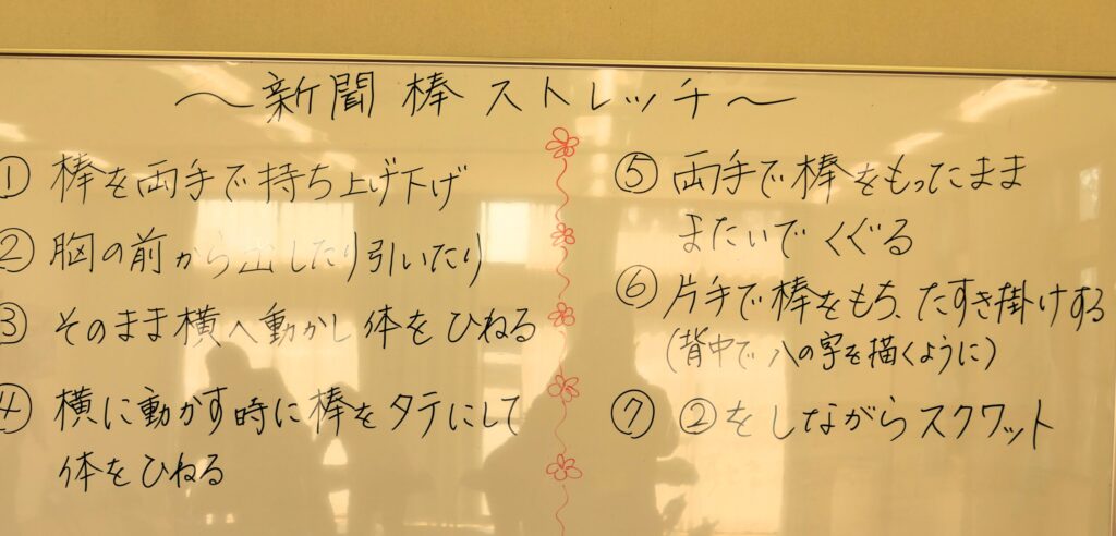 いつもの体操のあとは 新聞棒を使って ストレッチです。棒を両手で持って上げ下げしたり、腰をひねったり、背中で八の字にしたり…ん~なかなか効きますねぇ😆