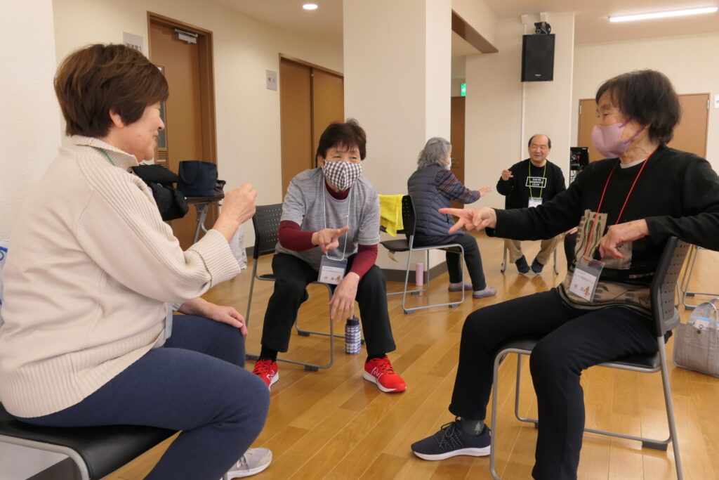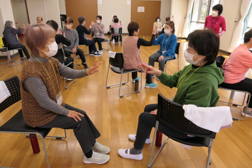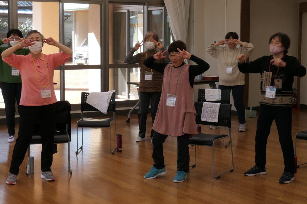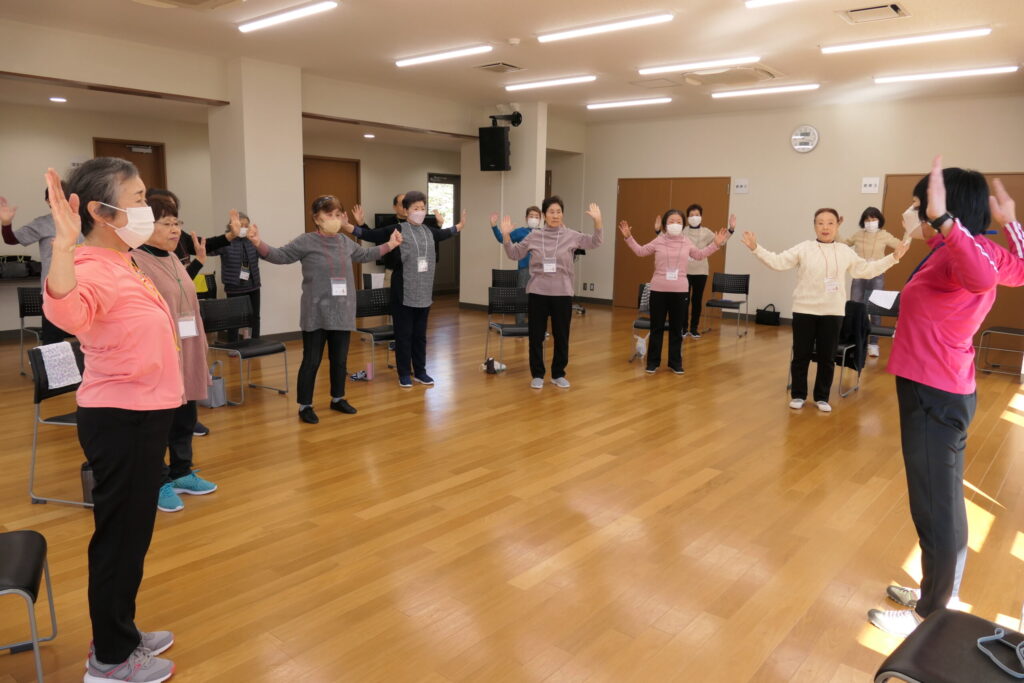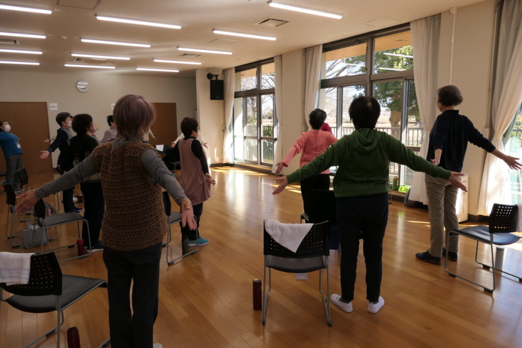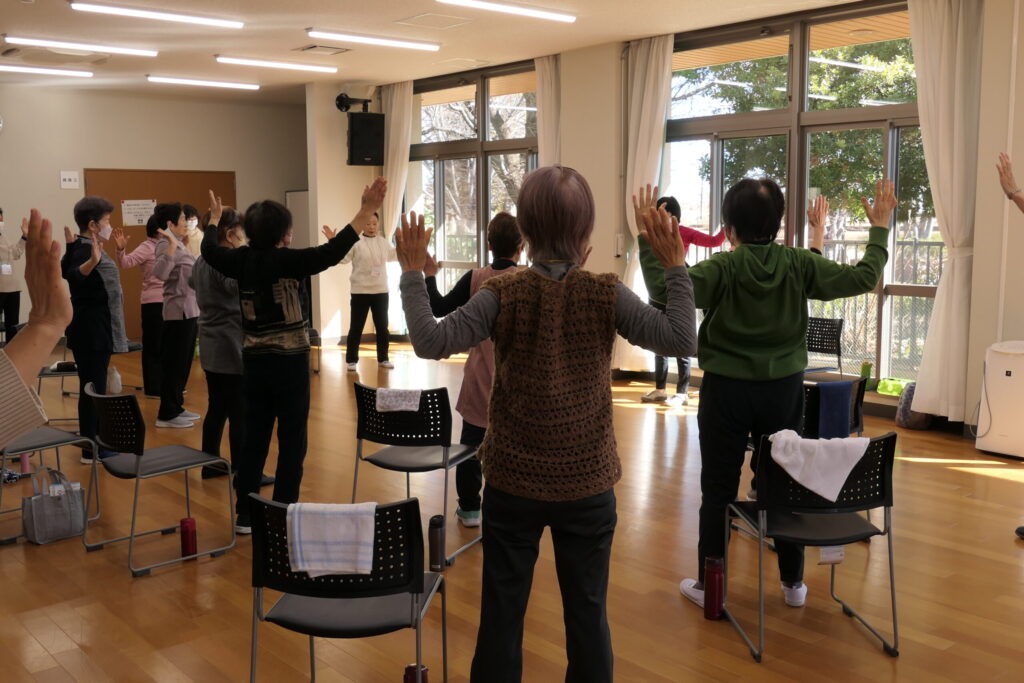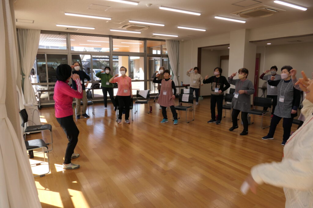 介護予防リーダー幡鎌さんの動きに合わせ踊りました!みなさん楽しそう🎵