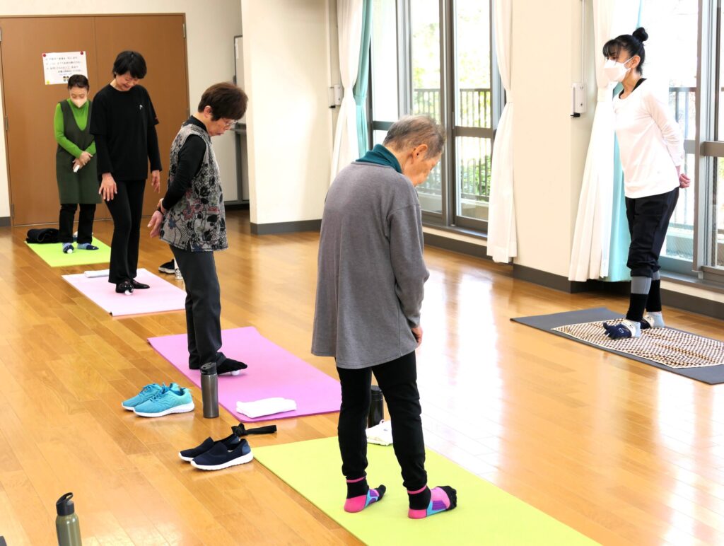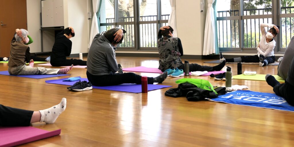 マットを使って しっかりとストレッチもしました。手で三角 △ 作りましょう~!