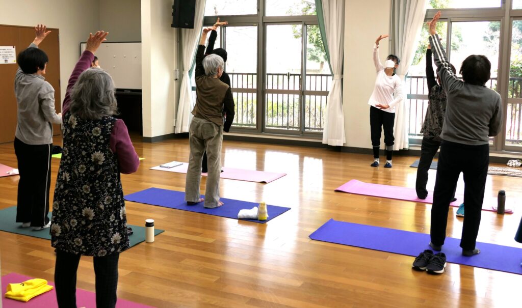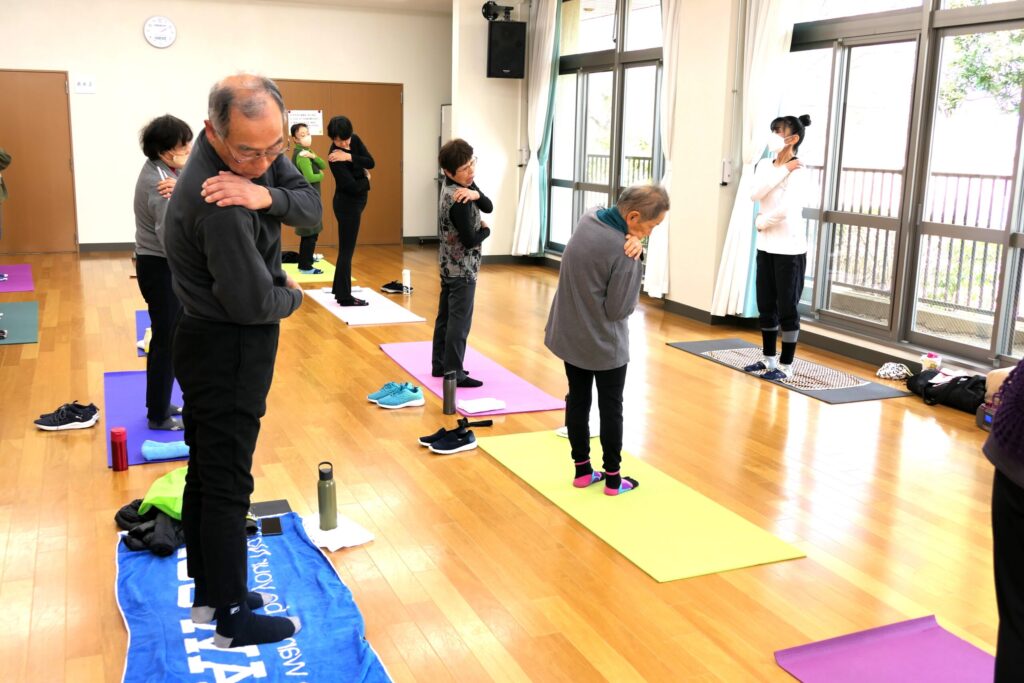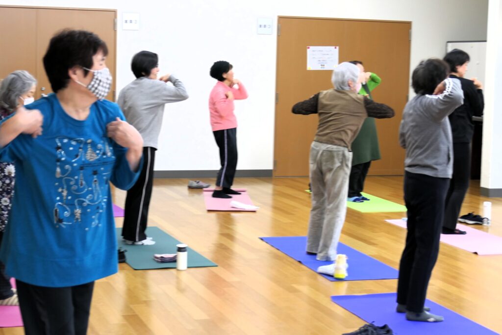 ひじまる体操では、肩に手をそえて クロールしたり、背泳ぎやバタフライ、平泳ぎを🐬